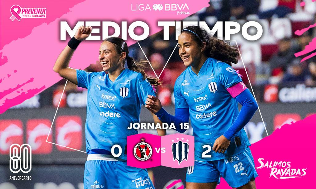 Al medio tiempo en el Estadio Caliente, las Rayadas de Monterrey vencen 2-0 a Tijuana en el partido de la Jornada 15 del Torneo Apertura 2025.